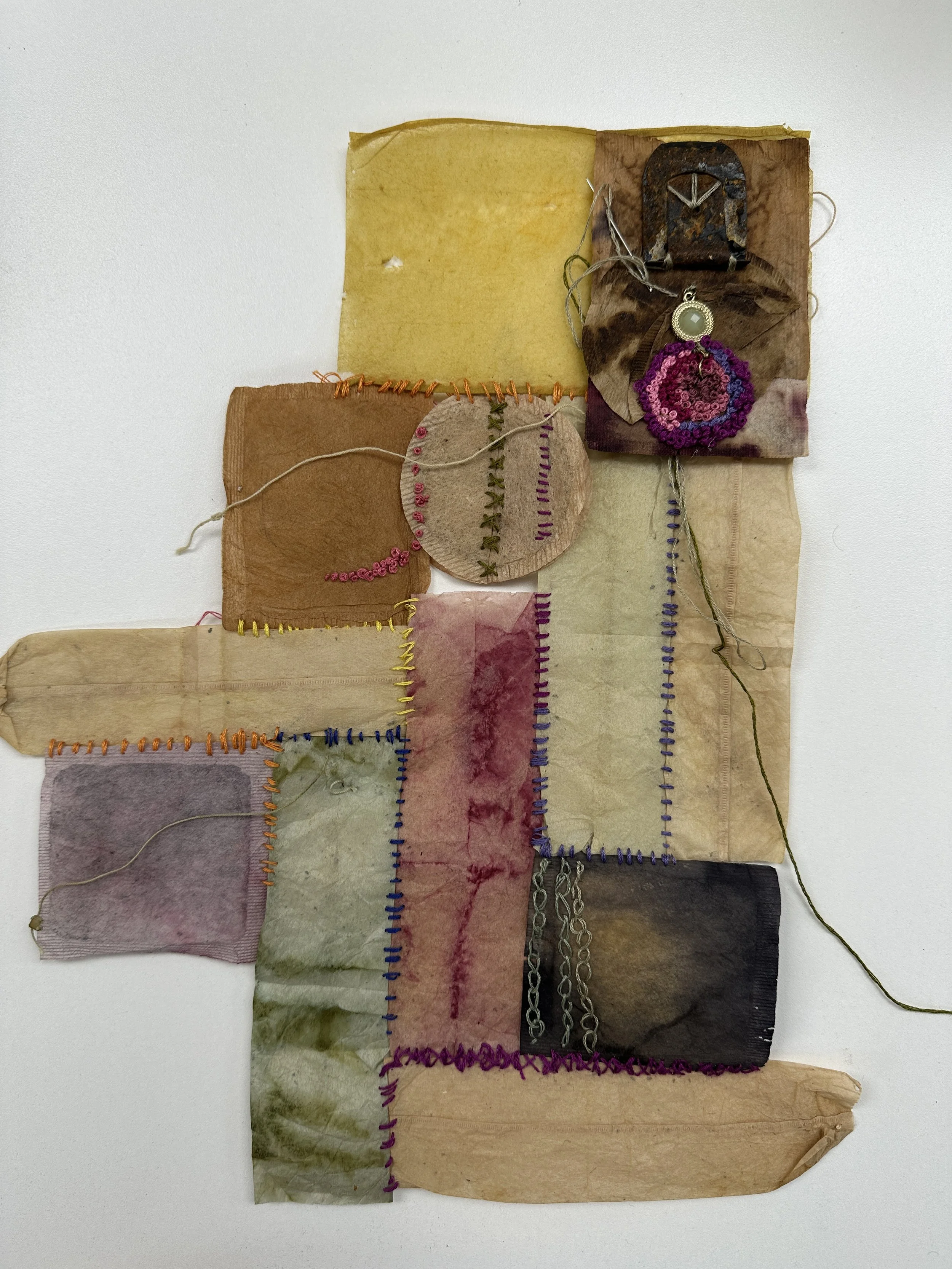 I had been wondering what to do with the myriads of tea bags leftover from staining and dying the silk cocoons for Emergence besides using them as substrates for my Marking Time tea bag collages. One idea was to make a wall size collage of the teabags. Semi-translucent, fragile and variously shaped, I am patching them together, using embroidery threads, and adding found objects. I play with color, shape and density. I have only just begun but know I want this to be quilt-sized, and hanging so that the light filters from behind, highlighting it’s transparency and delicacy.