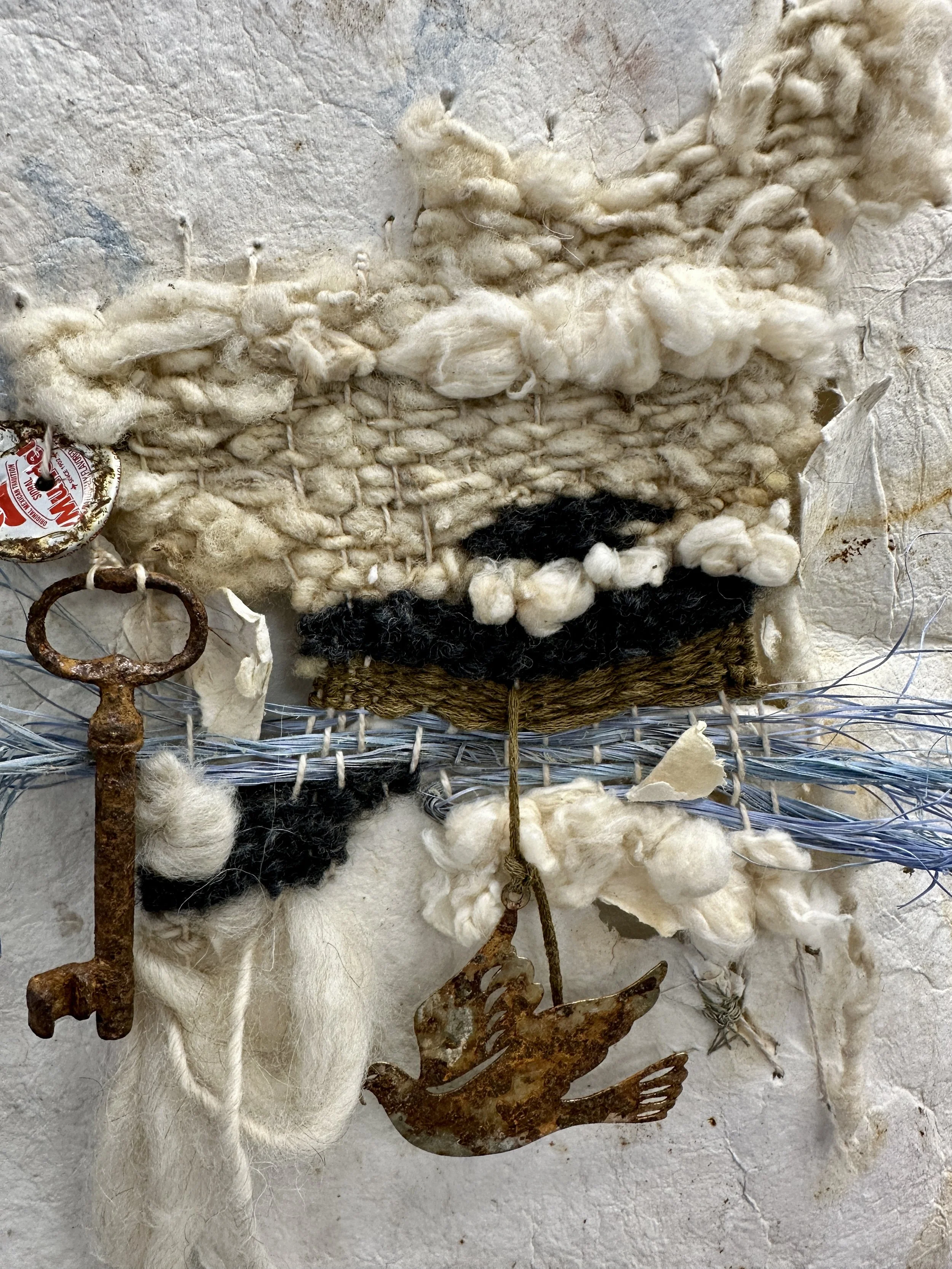 Several years ago, in a paper making class, at the Woman’s Studio Workshop in NY, I created a huge sheet of handmade paper. I cut up old cotton bed sheets and pulped them in a Reina Hollander Beater. The sheet was formed by pouring buckets and buckets of pulp into a 5 by 7 foot wood frame lined with mesh. Set on plaster buckets it was left to dry first in the sun and then on its mold within the workshop. It has a thick, textured and undulating surface. I loved it but wasn’t sure then how to use it! At an art residency at Vermont Studio Center, I rusted it with found rusty objects. The repeated working of the paper, wetting, drying and handling it caused several portions to tear. I hung it in my studio, spent much time looking at it and musing. For one of the ripped portions, I started a loose warp and created a weaving within the paper. I am very happy with the results and I am considering burning and repairing other portions of the paper. I am taking my time and letting the work speak to me and tell me in which direction to move forward. I trust that over time these materials will enable me to continue to convey the themes of memory and loss that I frequently address in my work.