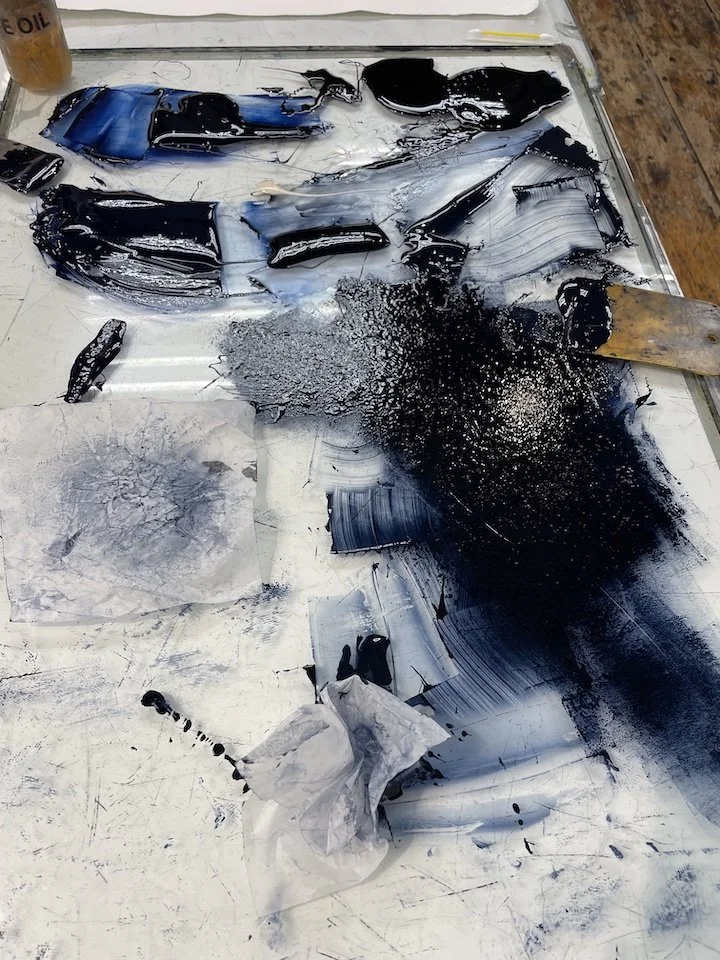 The stars aligned at summer’s end when I finally worked with Christopher Shore, master printer at CCP, and Mitchell Visoky, an artist and friend, to learn the process. I knew within hours this was a process I enjoyed and would help me convey what I wanted within my artwork. We spent a day making plates and another day inking and testing them.