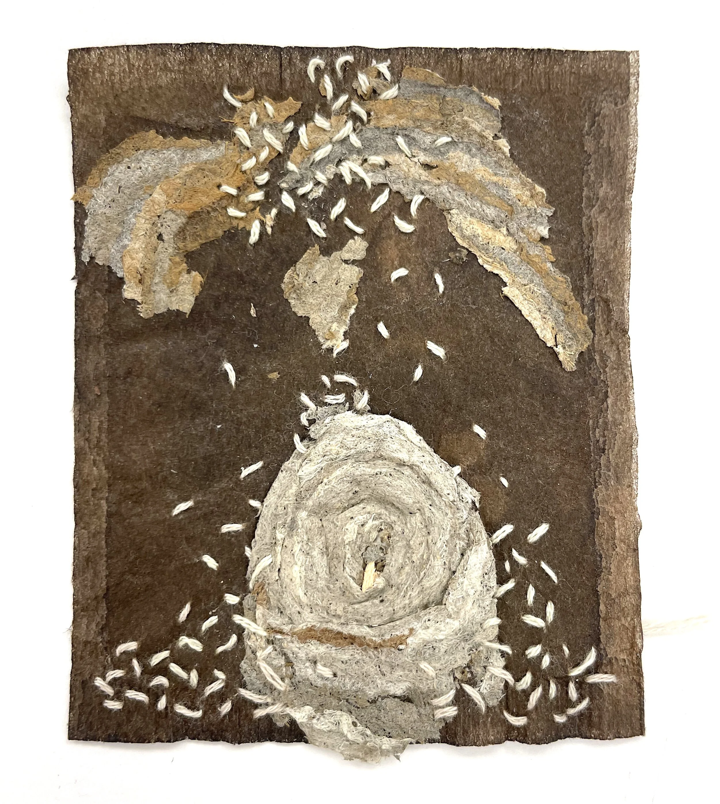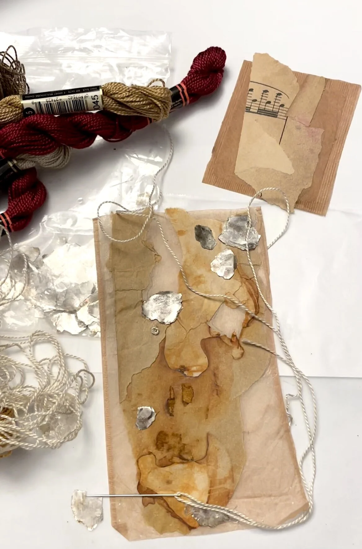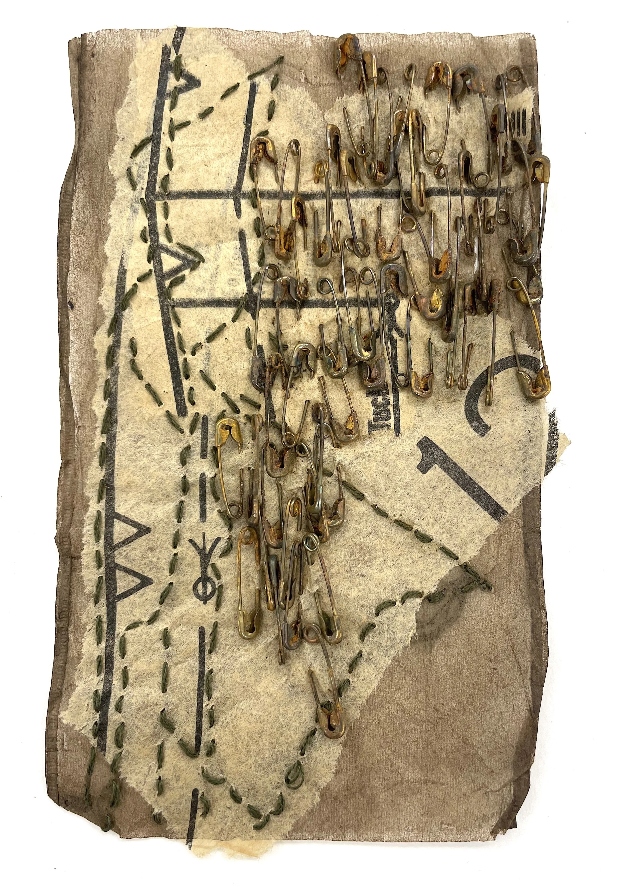 Puttering in my studio I sort through bags of collected ephemera. Objects that resonate, evoking memories of people, places, and experiences. Cocoons dyed with oak gall ink, tea and coffee, salvaged teabags from the dying. Birds’ nests, thorns, eggshells and vintage dress patterns and sheet music; browned and brittle with evocative discoloration reminiscent of watercolor. Empty weed pods, rusty metal pieces, burned scraps of paper. I layer and collage materials onto tiny tea bag canvases, then stitch and pierce with thread and thorns. They are daily meditations, composing and reclaiming memory and personal history brought into my current experience. It is reparative, healing and acts as a psychological and emotional anchor in tumultuous times. I find meaning through the making.