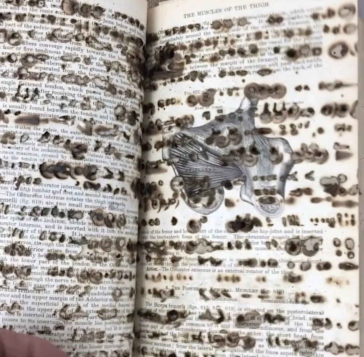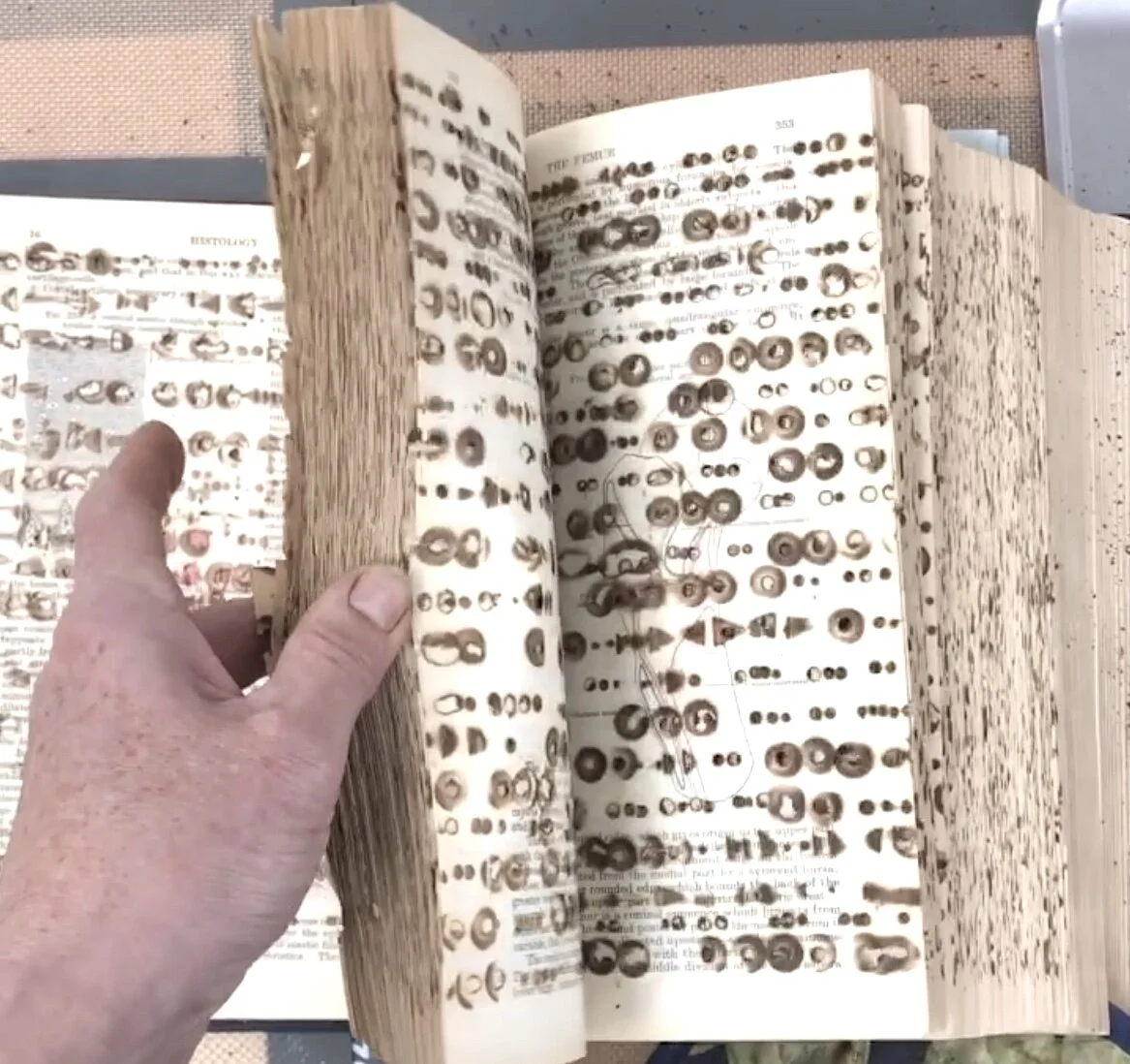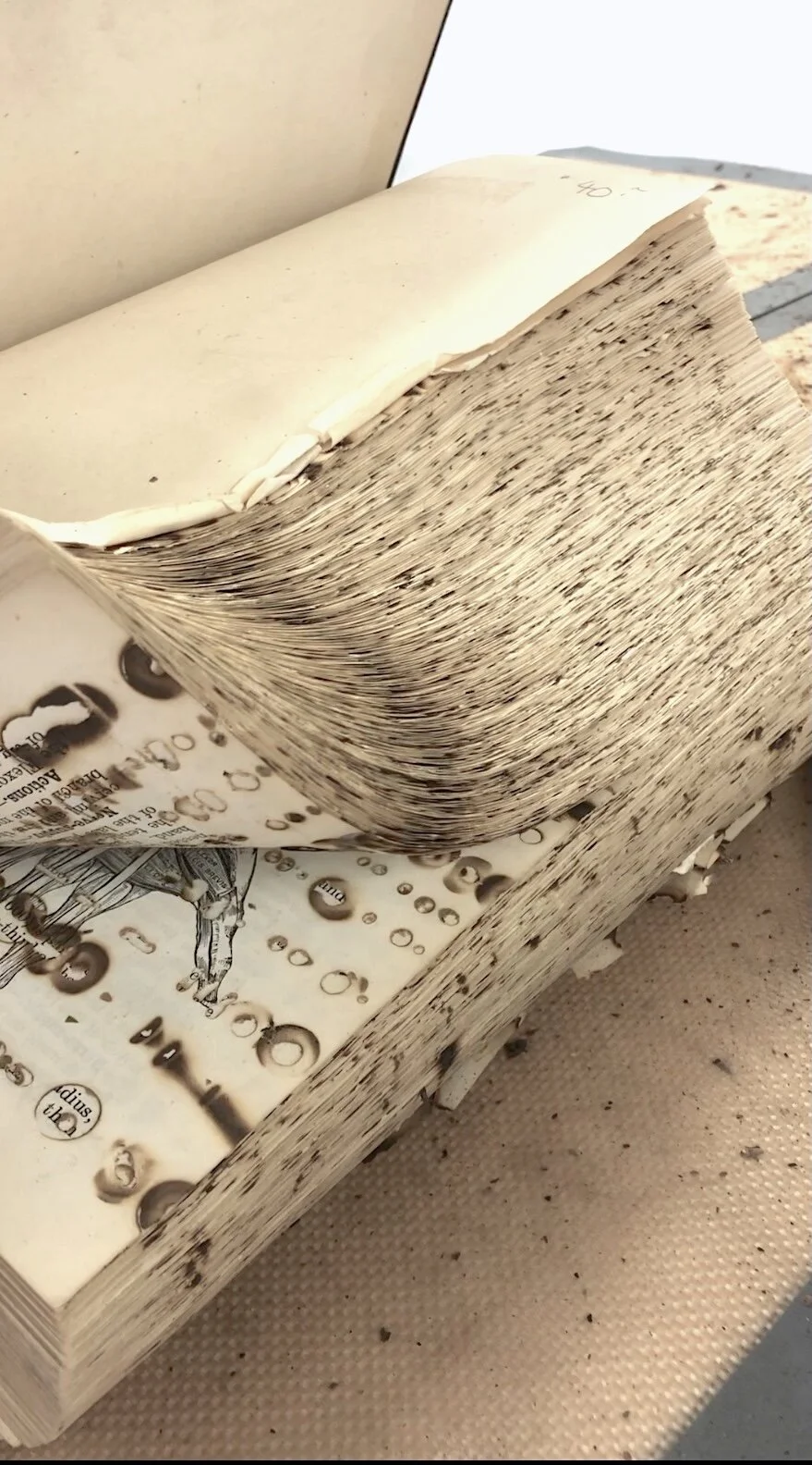 Overwritten was created in response to the Trump presidency. Each day I was bombarded by an increasing number of lies, obfuscations and derision for and denial of fact, science, medical expertise and knowledge. Basic humanity, honesty, kindness and responsibility towards those with less visibility, voice, access and means was scoffed at and labeled as weakness. I chose a medical textbook, which at one time would be used to educate and systematically burned a page for each day the Trump administration held office. What remains appears to be a sort of code or language that both destroys the existing information while replacing it with a nonsensical, unreadable and destructive text.