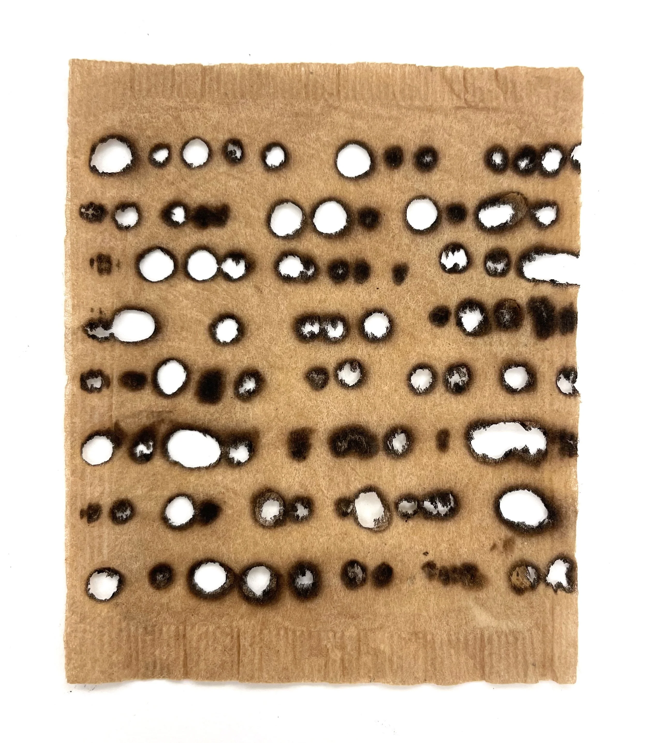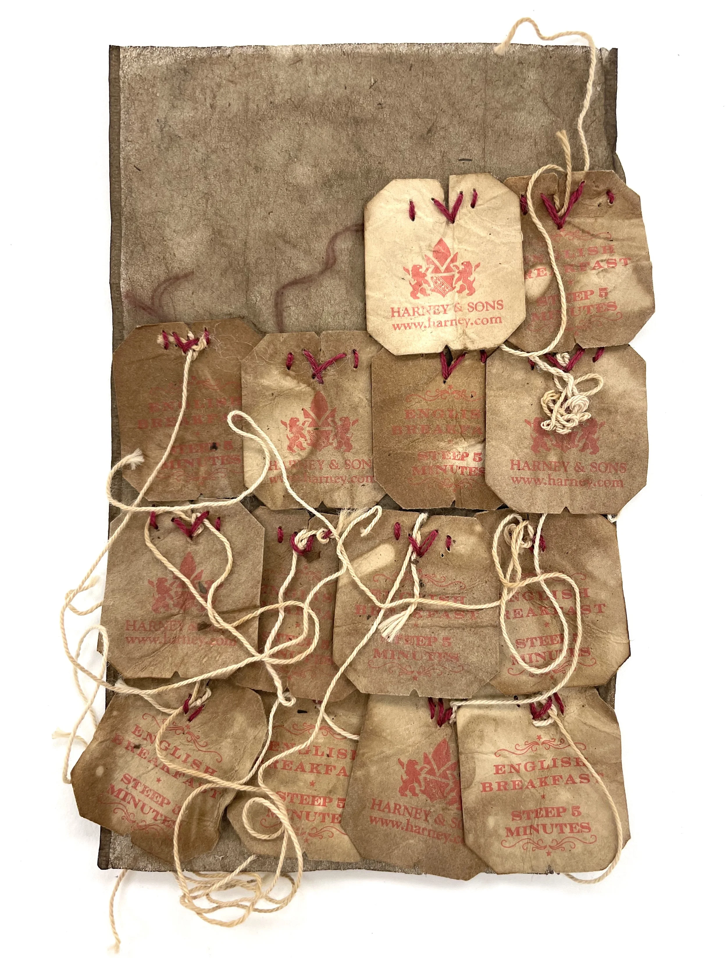 Puttering in my studio I sort through bags of collected ephemera. Objects that resonate, evoking memories of people, places, and experiences. Cocoons dyed with oak gall ink, tea and coffee, salvaged teabags from the dying. Birds’ nests, thorns, eggshells and vintage dress patterns and sheet music; browned and brittle with evocative discoloration reminiscent of watercolor. Empty weed pods, rusty metal pieces, burned scraps of paper. I layer and collage materials onto tiny tea bag canvases, then stitch and pierce with thread and thorns. They are daily meditations, composing and reclaiming memory and personal history brought into my current experience. It is reparative, healing and acts as a psychological and emotional anchor in tumultuous times. I find meaning through the making.